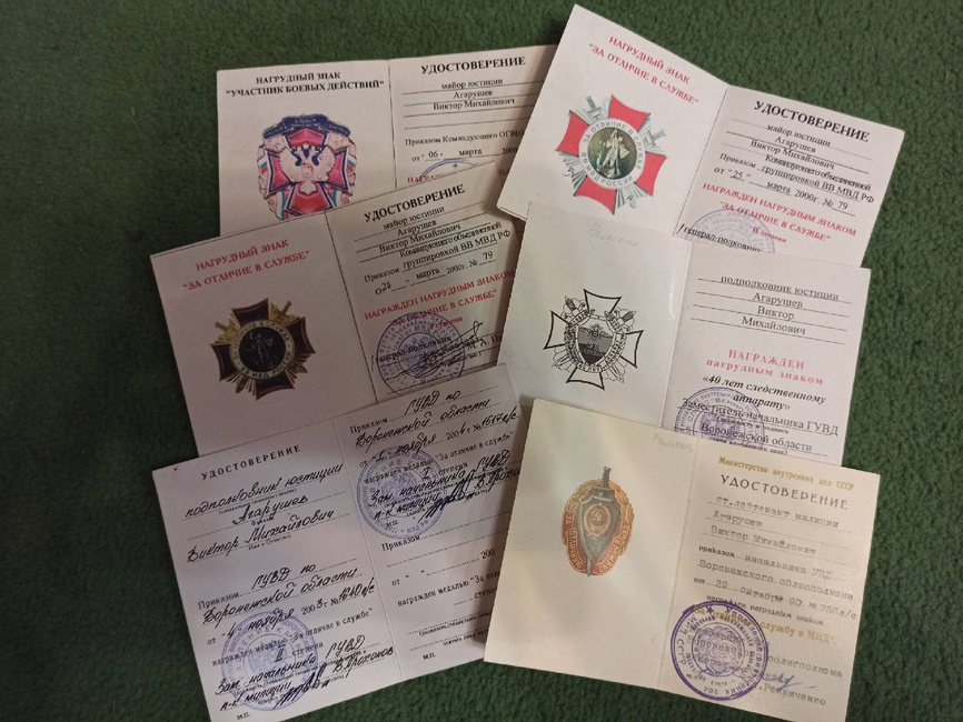 За свою службу в органах МВД Агарушев Виктор Михайлович награждён медалями за безупречную службу в МВД и является "участником боевых действий". 23 года своей службы в МВД было отдано следственной работе.