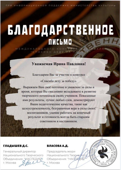 Руководитель Дарьи - Ирина Полякова отмечсена учредителями конкурса Благодарственным письмом.