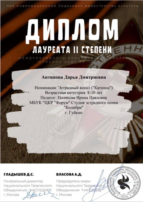 Поздравляем воспитанницу студии эстрадного пения "Колибри" Антипову Дарью, ставшую Лауреатом II степени Международного конкурса-фестиваля "СПАСИБО ДЕДУ ЗА ПОБЕДУ"!