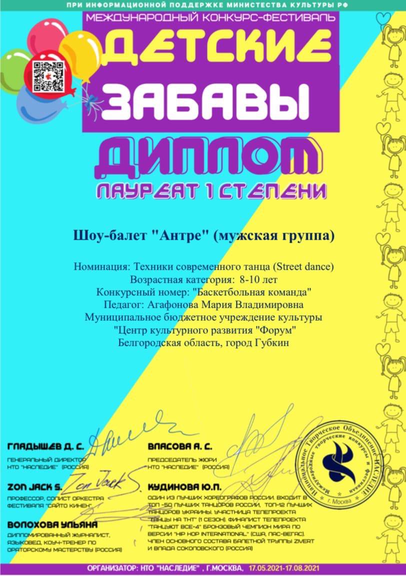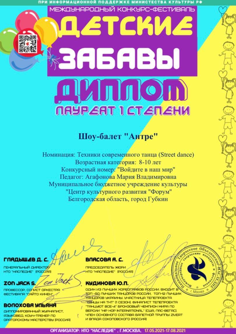 Младшая группа шоу-балета "Антре" приняла участие в Международном конкурсе-фестивале "Детские забавы". Ребята достойно выступили и получили заслуженные дипломы! Поздравляем от всей души!