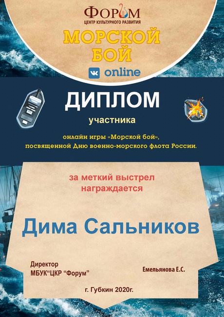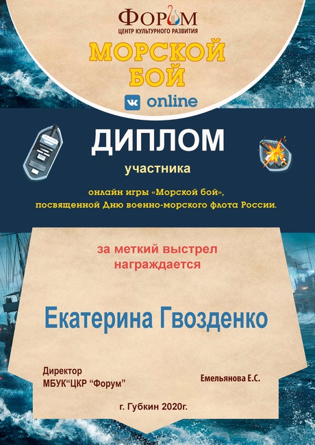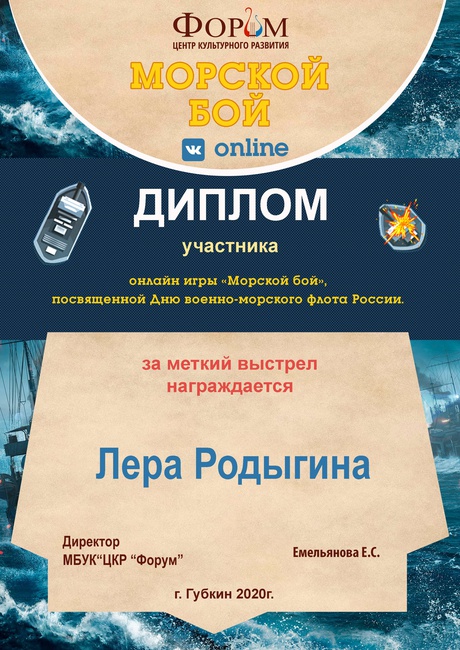 Виртуальный "Морской бой" состоялся в сообществе Центра культурного развития "Форум" в социальной сети "Вконтакте". Участники оставляли в комментариях координаты "выстрела", следили за выстрелами соперников и буквально за три дня справились со всеми кораблями.