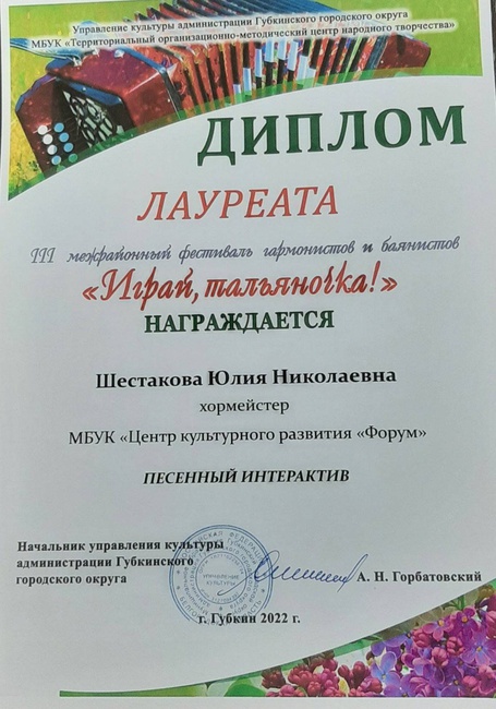 8 мая в сквере шахтерской Славы им. В.М. Кислова состоялся III Межрайонный фестиваль гармонистов и баянистов «Играй, Тальяночка!». Центр культурной развития «Форум» в этом фестивале представляли замечательный музыкант, аккомпаниатор «Народного самодеятельного коллектива» студии сольного пения «Ретро» - Веретенников Юрий Иванович и потрясающая вокалистка, хормейстер «Народного самодеятельного коллектива» ансамбля народной песни «Славянская душа» - Юлия Николаевна Шестакова. Ах, сколько песен спето о гармони, Не сосчитать написанных стихов! Ну как, скажите, душу не затронет Коронный звук развёрнутых мехов! Поздравляем Юлию Николаевну и Юрия Ивановича с блистательными выступлениями!
