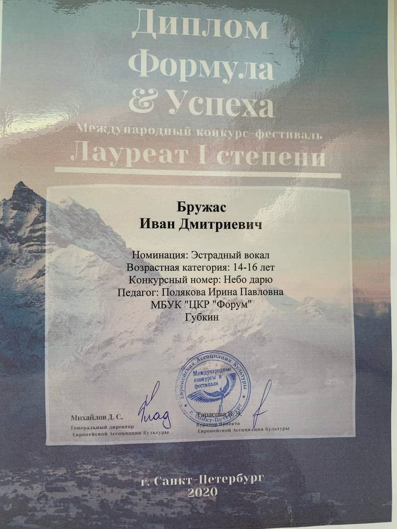 Воспитанник Ирины Поляковой солист студии эстрадного пения "Колибри" стал Лауреатом I степени Международного конкурса-фестиваля "Формула успеха"! Поздравляем Ивана и желаем новых творческих побед!