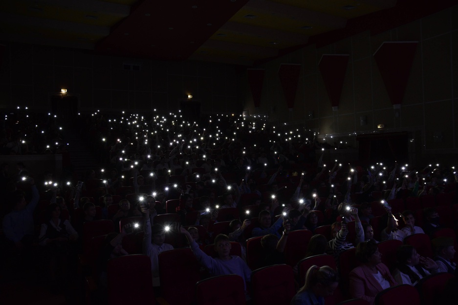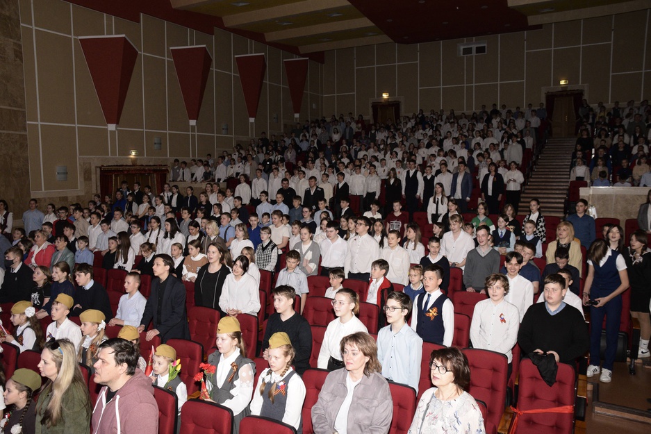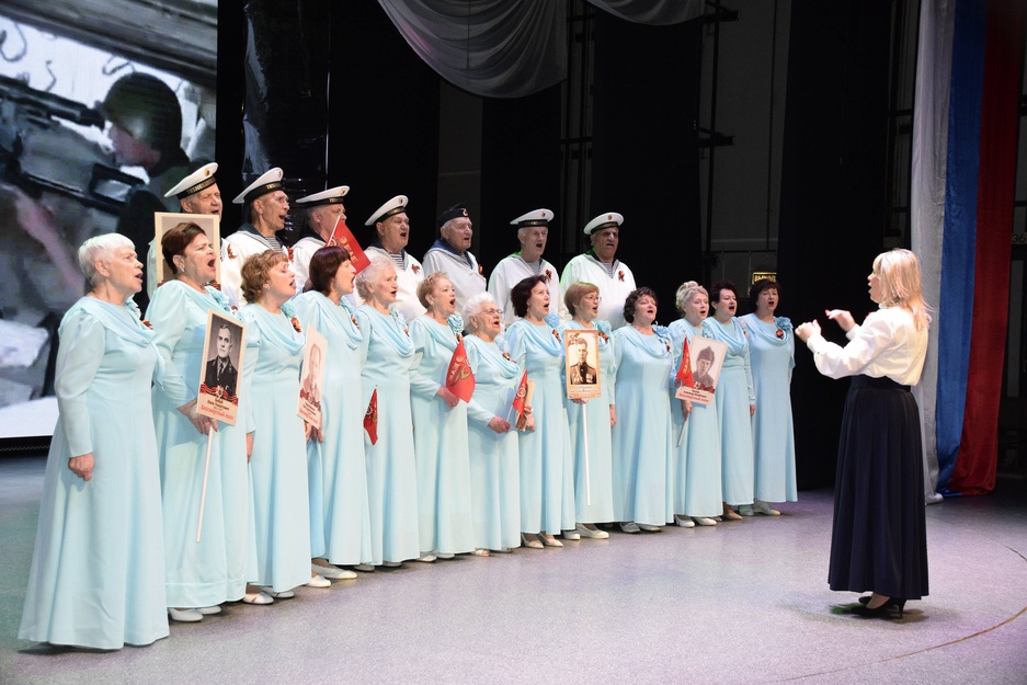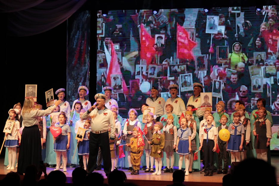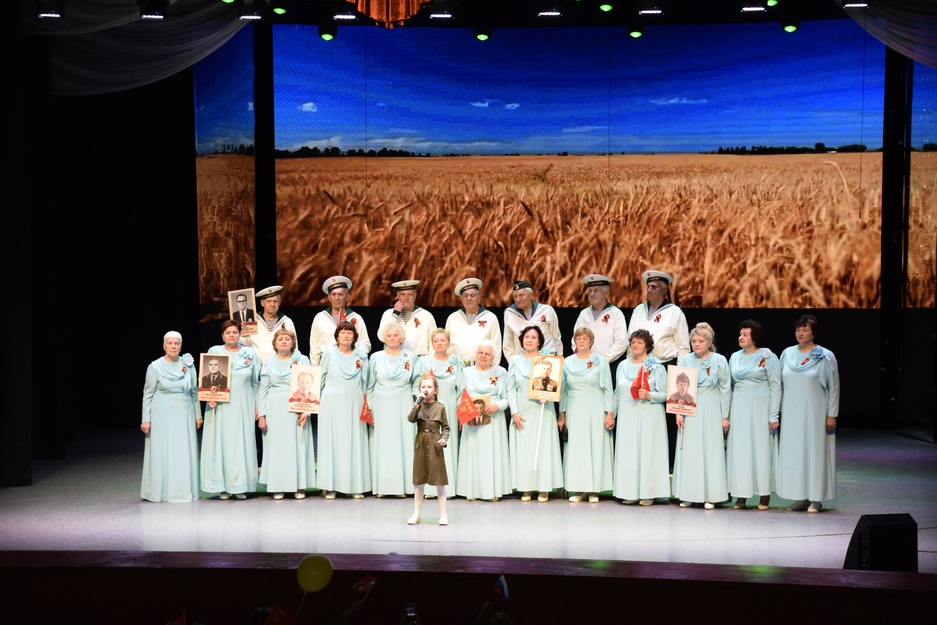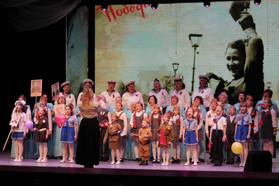 Завершился концерт песней День Победы, которую исполнили вместе с хором детский вокальный коллектив "Бамбини", участники военно-патриотического клуба "Искорки" и все зрители в зале.