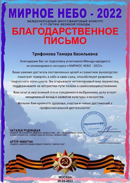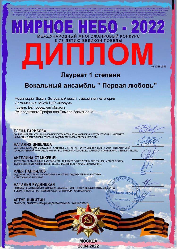 Муниципальный вокальный ансамбль "ПЕРВАЯ ЛЮБОВЬ" принял участие в Международном многожанровом конкурсе "МИРНОЕ НЕБО - 2022" к 77-летию Великой Победы. Наша победа посвящена павшим героям этой войны, а также -вернувшимся живыми. "Никто не забыт, ничто не забыто!"