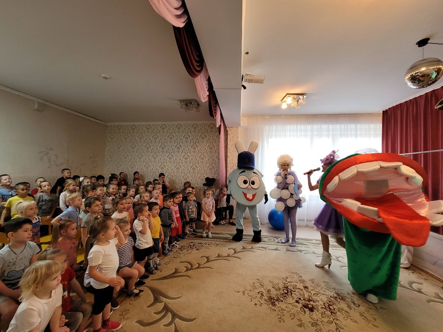 Для ребят Детского сада № 2 «РОМАШКА» состоялась театрализованная игровая программа «Мыльная опера». Добрая Мыльница из страны Чистюлии отправилась в путешествие вместе с Крошем. Юные зрители окунулись в атмосферу сказки и волшебства, познакомились с правилами личной гигиены, а также привили Крошу любовь к чистоте и опрятности. Верными помощниками для путешественников стали Клоунесса Жужа, Мишка, Зубная фея и ее помощник Зубастик.