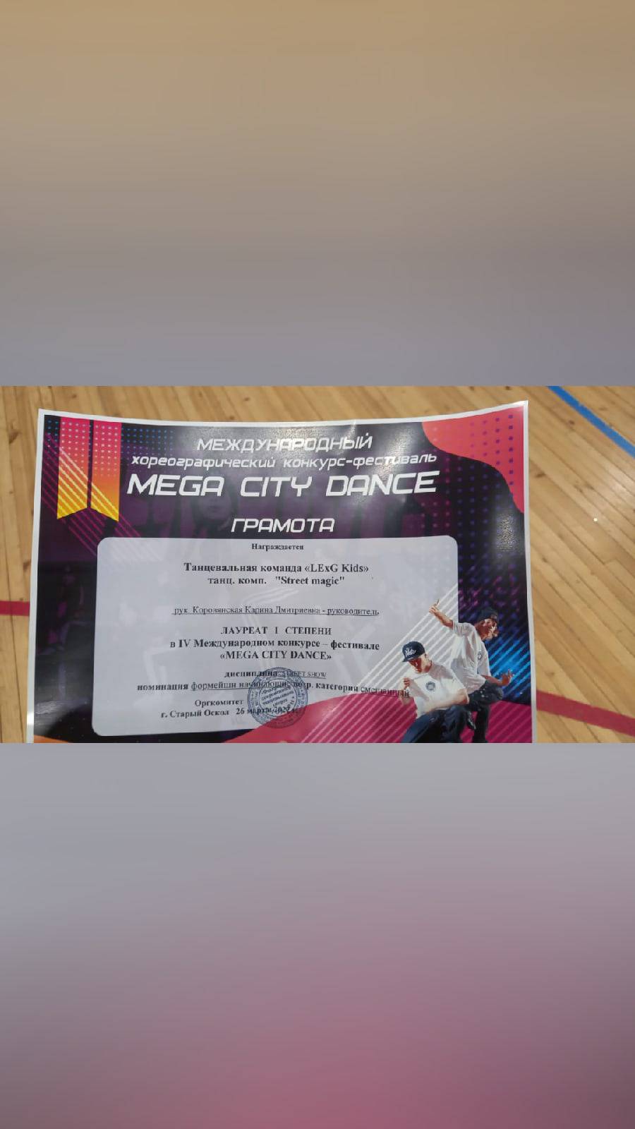 26 марта танцевальная команда LExG Kids впервые приняла участие в Международном хореографическом конкурсе-фестивале MEGA CITY DANCE г.Старый Оскол и стала лауреатом I степени.Дети испытали невероятные эмоции. Для них это был первый огромный опыт, возможность показать свои лучшие способности и конечно же получить свою заслуженную награду! Была и работа над собой, и спортивный азарт, и конечно же вкус победы! Все, что нужно, чтобы ковался спортивный характер!У детей остались положительные и радостные впечатления от соревнований!