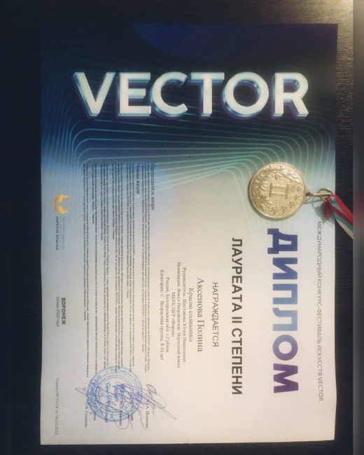 Полина вместе с руководителем - Юлией Шестаковой, приняла участие в Международном конкурсе-фестивале искусств VECTOR в городе Воронеж. На данном этапе творческого пути все цели, которые были поставлены Полина выполнила и стала Лауреатом II степени в таком серьезном конкурсе!