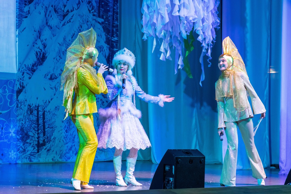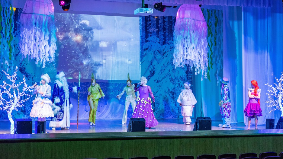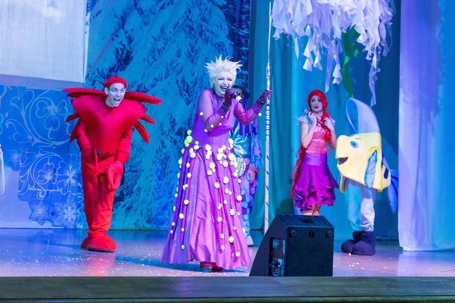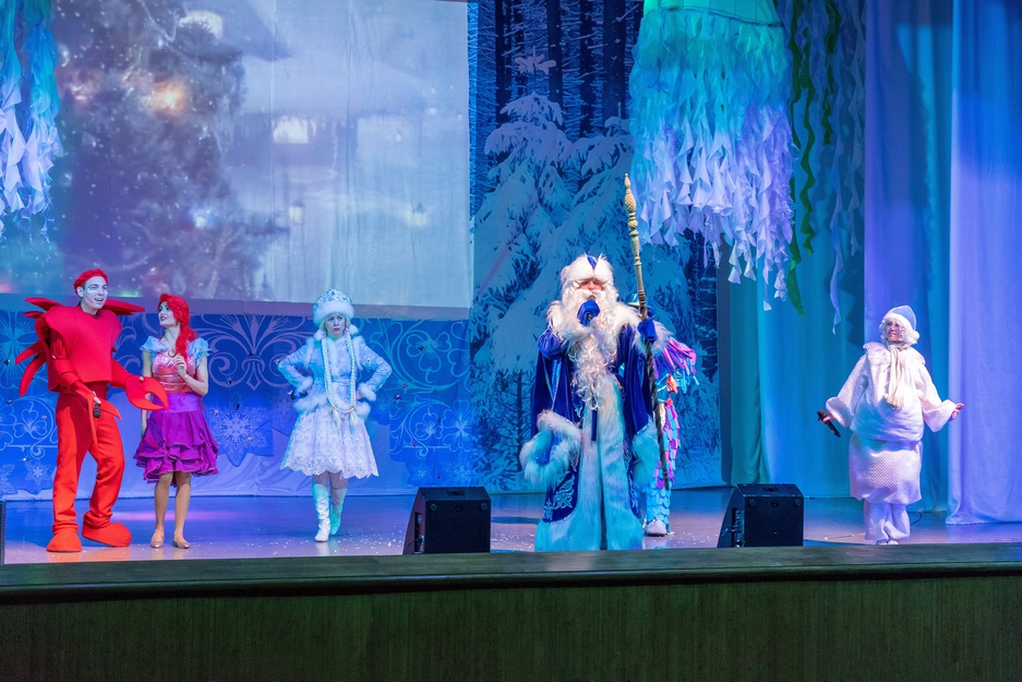 В этом году ребята и взрослые совершили увлекательное путешествие с русалочкой Ариэль и крабом Себастьяном на новогодний бал к Деду Морозу, которое было наполнено удивительными приключениями. Подводная ведьма Урсула со своими верными слугами морскими Коньками строили на пути Ариэль и её друзей пакости: заколдовали Снегурочку, которая забыла что такое зима и новогодние праздники, отняли трезубец у Нептуна, но благодаря дружбе добро вновь победило зло! Морские жители попали на главную ёлку к Морозу. Дети показали, как умеют веселиться, научили Ариэль зимним играм и танцам.