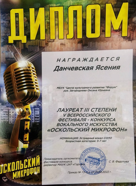 От всей души поздравляем нашу юную артистку, солистку вокального коллектива «Бамбини» Ясению Данчевскую с первой победой. Желаем творческих успехов и новых достижений.