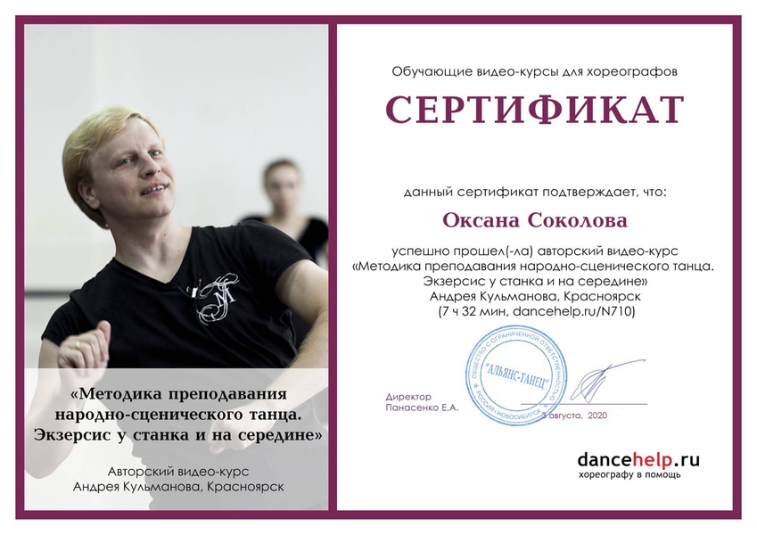 Ее багаж знаний пополнился опытом новой методики преподавания народного танца от ведущего солиста Красноярского Государственного Академического ансамбля танца Сибири им. М.С. Годенко Андрея Кульманова.