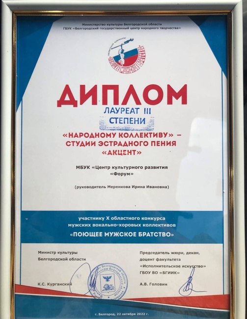 22 октября в п. Ракитное прошёл X Областной конкурс мужских вокально-хоровых коллективов «Поющее мужское братство», в котором приняли участие 16 вокальных мужских коллективов области. Студия вокального пения "Акцент" (руководитель Ирина Меренкова) стала лауреатом III степени.
