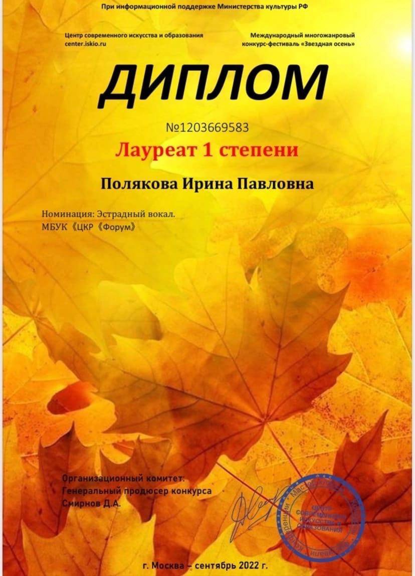 Руководитель СЭП «Колибри» Ирина Полякова стала лауреатом I степени Международного конкурса «Звездная осень».