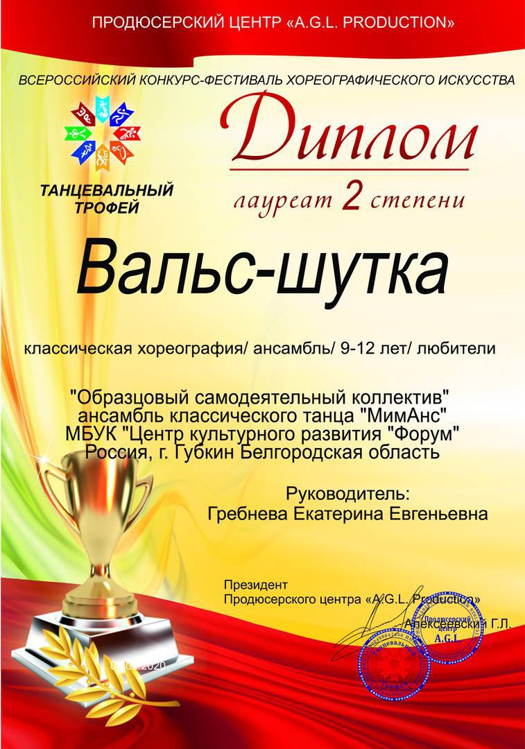 Ансамбль классического танца "МимАнс" Центра культурного развития "Форум" стал серебряным призером Всероссийского конкурса-фестиваля хореографического искусства "Танцевальный трофей".
