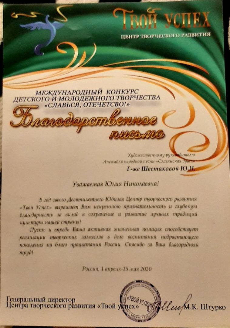 Благодарственным письмом "За вклад в развитие и сохранеий лучших традиций культуры России" отмечена руководитель ансамбля - Юлия Николаевна Шестакова.