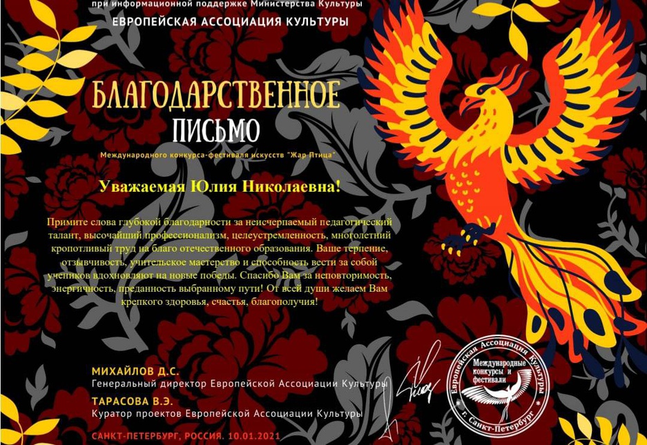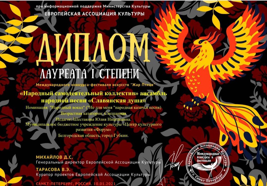 Ансамбль народной песни "Славянская душа" принял участие в Международном конкурсе-фестивале искусств "Жар Птица". В номинации "Народный вокал" народная казачья песня "Не для меня" в исполнении ансамбля отмечена Дипломом Лауреата 1 степени!!!