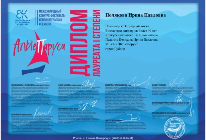 Ирина Полякова стала лауреатом I степени двух Международных конкурсов «Алые паруса» г.Санкт-Петербург и Международный конкурс «NEW STAR» г.Москва. Кстати, члены жюри высоко оценили новую песню "По полюшку"! Участие в конкурсе - это своего рода остановка, взгляд на свою деятельность со стороны. Ведь оно рождает уверенность в собственных силах и устремляет вперёд!