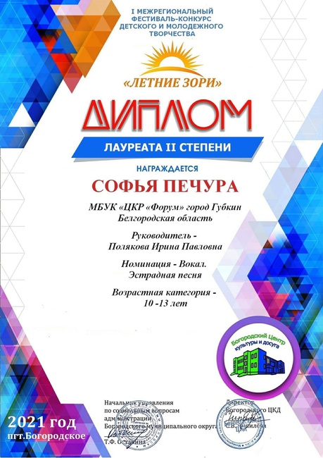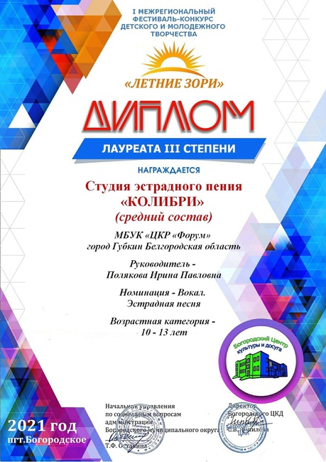 Группа «Колибри», дуэт и солисты, стали победителями межрегионального конкурса «Летние зори» пгт.Богородское. В этом конкурсе были и участники, и дипломанты, а в нашем коллективе - все лауреаты!