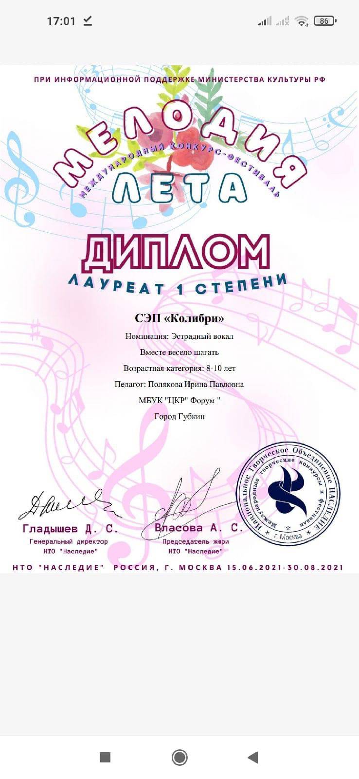 Кроме того, СЭП «Колибри» приняли участие в Международном конкурсе «Мелодия лета» г.Москва и стали лауреатами:
