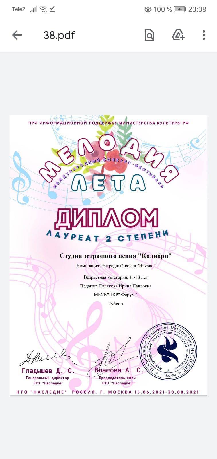 -лауреат II степени ансамбль «Колибри» (старший состав).