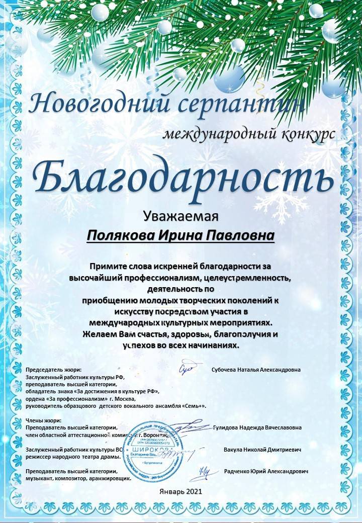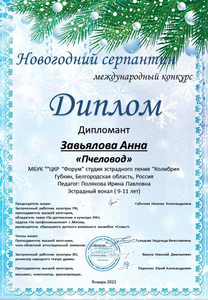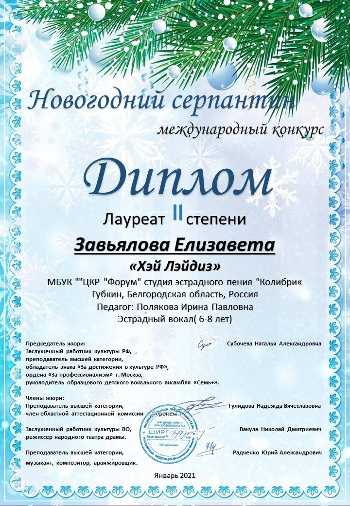 Солисты младшей группы "Колибри" впервые приняли участие в конкурсе! Дипломом Лауреата II степени Международного конкурса "Новогодний серпантин" награждена Завьялова Елизавета, Завьялова Анна стала Дипломантом. Поздравляем, у вас всё ещё впереди!
