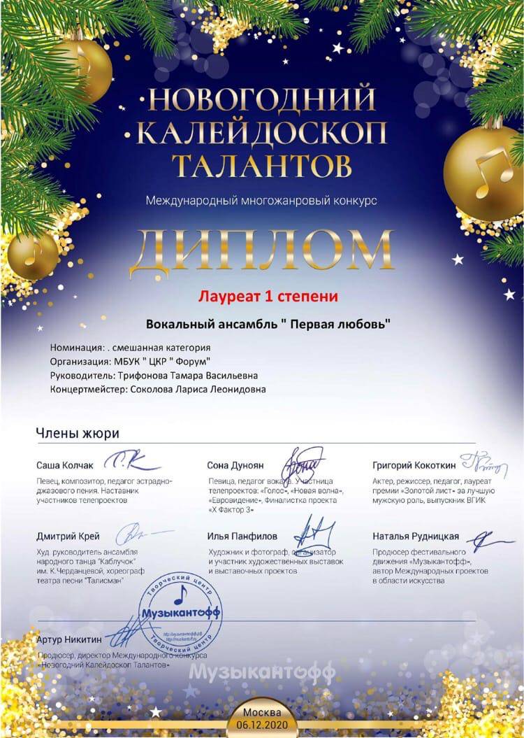 Вокальный ансамбль "Первая любовь" в Международном многожанровом конкурсе "Новогодний калейдоскоп талантов" стал Лауреатом I степени!!!