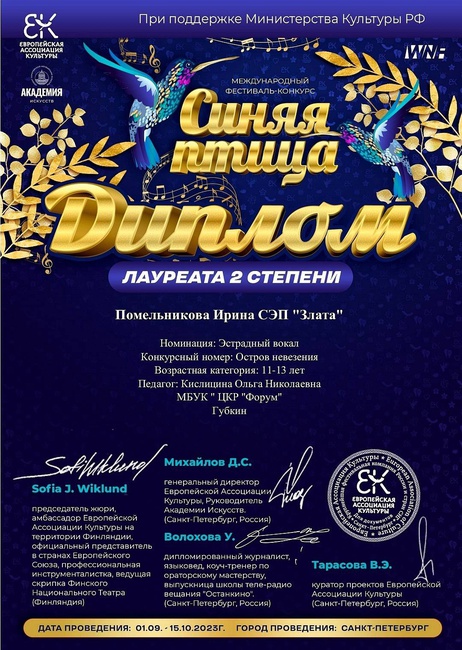 Международный конкурс "Синяя птица" - Лауреат 2 ст.