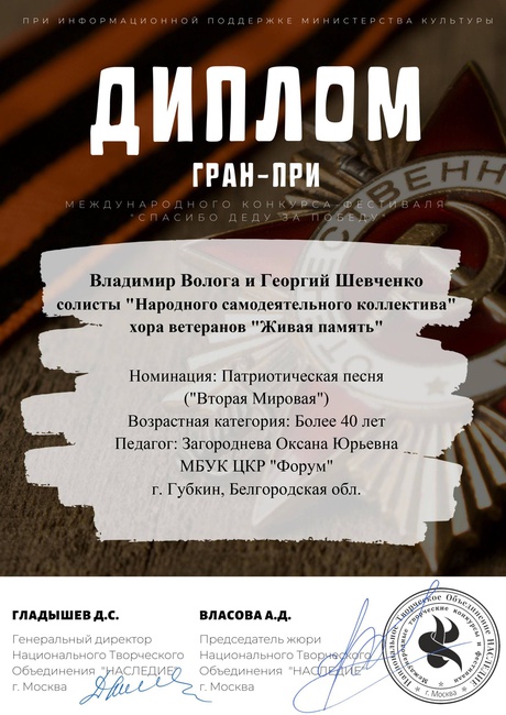 Владимир Волога и Георгий Шевченко - солисты хора ветеранов "Живая память" приняли участие в Международном конкурсе "Спасибо деду за Победу", который проводится при информационной поддержке Министерства культуры РФ. Дуэт получил высшую конкурсную награду - ГРАН-ПРИ за исполнение песни "Вторая Мировая" в номинации "Патриотическая песня".