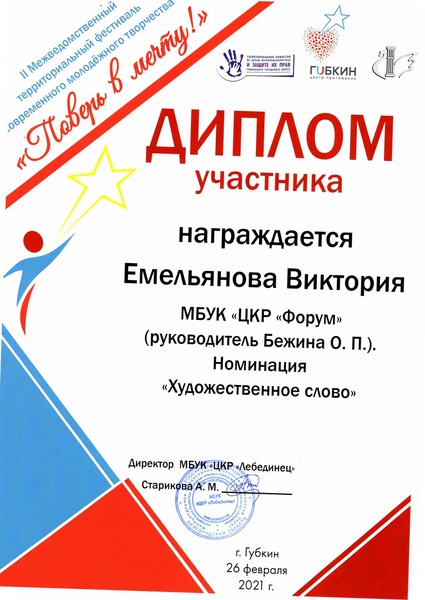 26 февраля участницы старшей группы театральной студии "Ровесник" Софья Овсянникова и Виктория Емельянова приняли участие во II Межведомственном территориальном фестивале современного молодёжного творчества "Поверь в мечту!".