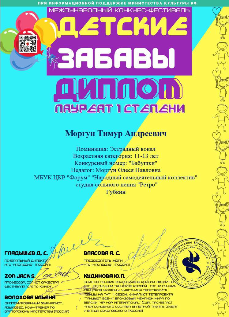 Моргун Тимур - Лауреат I степени Международного Конкурса-фестиваля "Детские забавы";