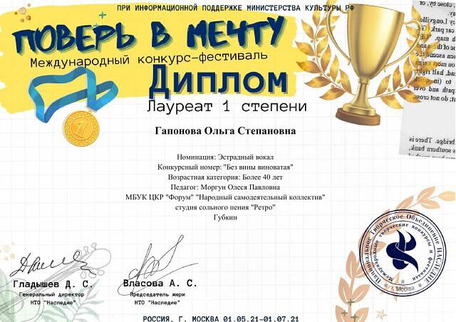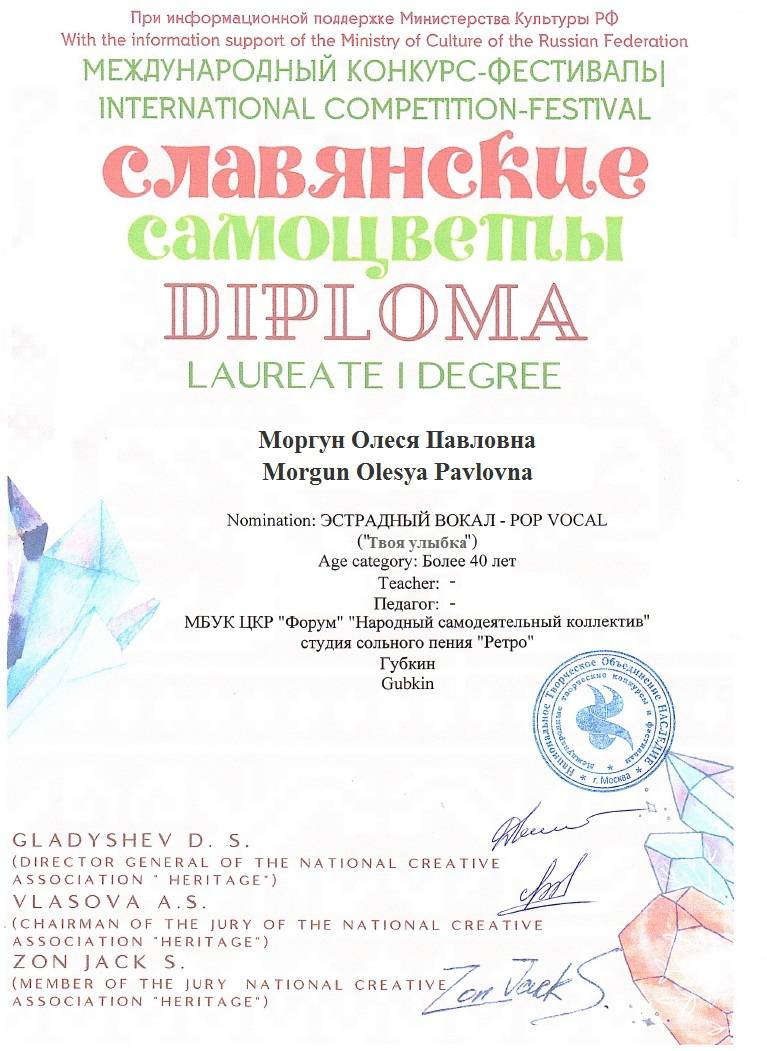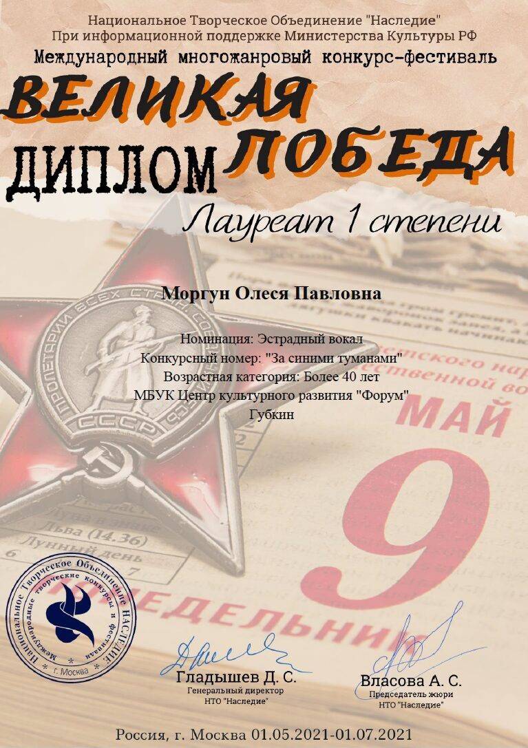 Моргун Олеся - Лауреат I степени Международного многожанрового Конкурса-фестиваля "Великая Победа".