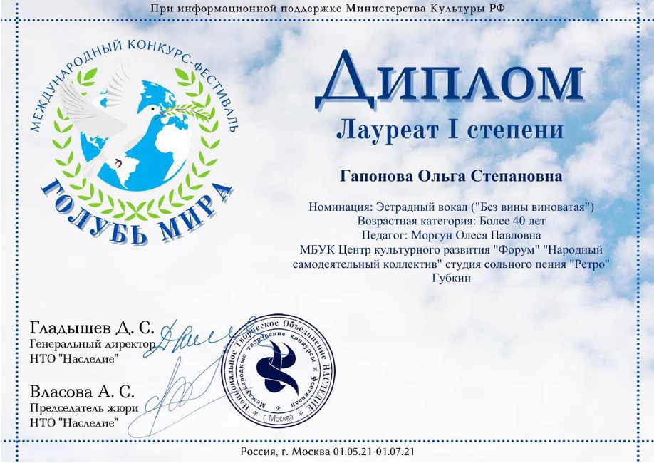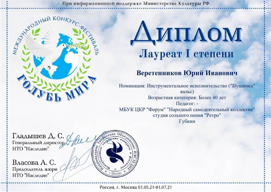 Участники "Народного самодеятельного коллектива" студии сольного пения "Ретро", Ольга Гапонова и Юрий Веретенников - Лауреаты l степени Международного конкурса - фестиваля "Голубь мира". Поздравляем