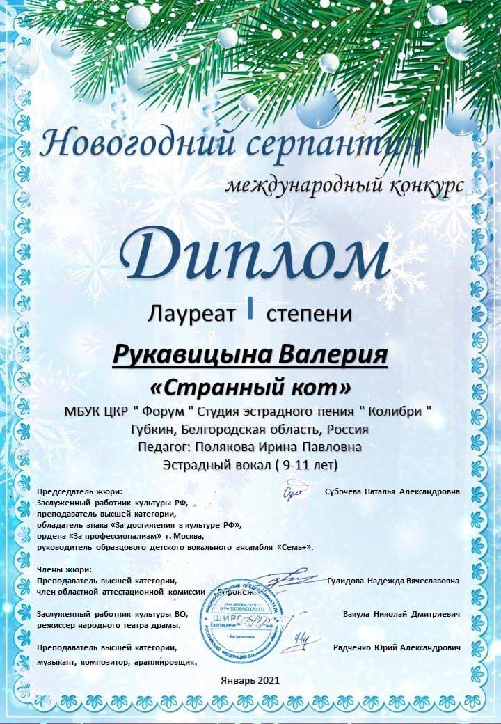 Поздравляем воспитанницу Ирины Поляковой - вокалистку студии эстрадного пения "Колибри" Валерию Рукавицину с победой в Международном конкурсе "Новогодний серпантин"!