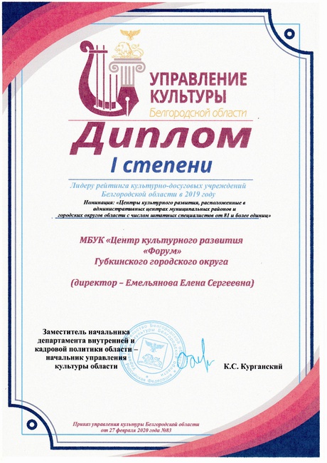 Настало время подвести итоги ушедшего года среди организаций культурно-досугового типа Белгородской области. Центр культурного развития "Форум" признан Лидером рейтинга культурно-досуговых учреждений Белгородской области в 2019 году и в номинации "Центры культурного развития, расположенные в административных центрах муниципальных районов и городских округов области с числом штатных специалистов от 81 и более единиц" награжден Дипломом I степени!!!