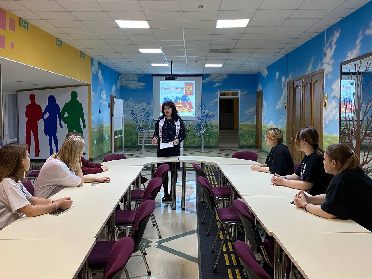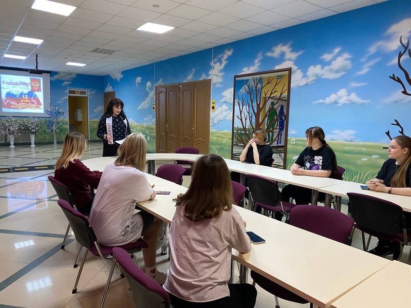 Шутова Елена (заведующий отделом по работе с детьми и молодёжью) рассказала ребятам об истории принятия Конституции, ее основах и целях создания, дала определения основным понятиям политики: «Федерация», «Президент», «Парламент», «Правительство РФ». Затем все участники мероприятия ответили на вопросы викторины «Государство и закон».