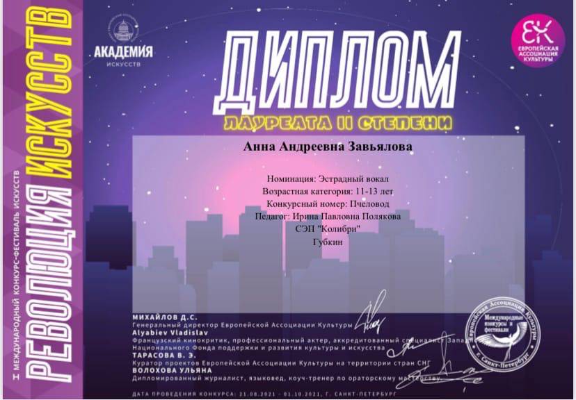 - Лауреат II степени Анна Завьялова ;