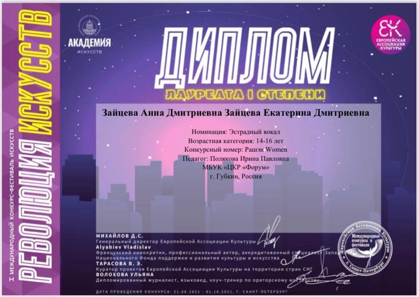 - Лауреат I степени Анна Зайцева и Екатерина Зайцева ;