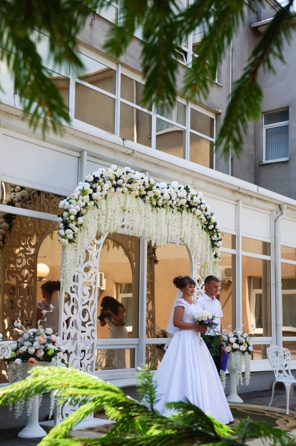 Главным украшение праздника станет арка, под сводом которой вы произнесете друг другу слова клятвы. Она оформлена нежными цветами и затейливым воздушным узором;