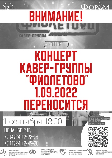 Уважаемые наши подписчики, концерт кавер-группы «Фиолетово» переносится, приносим свои извинения. Мы опубликуем новую дату, как только она станет известна!