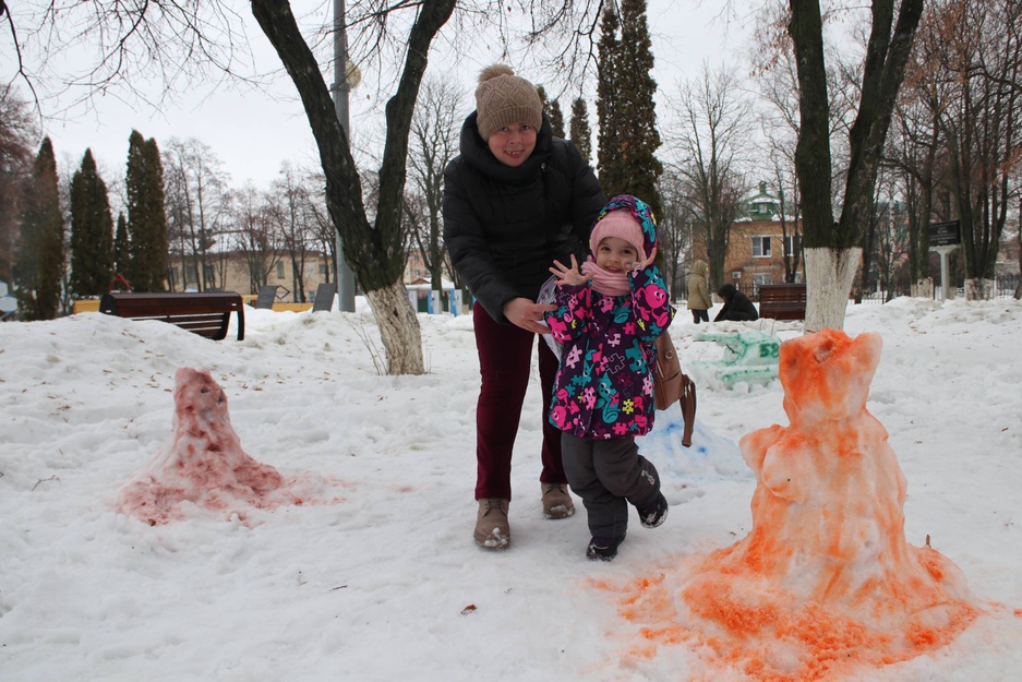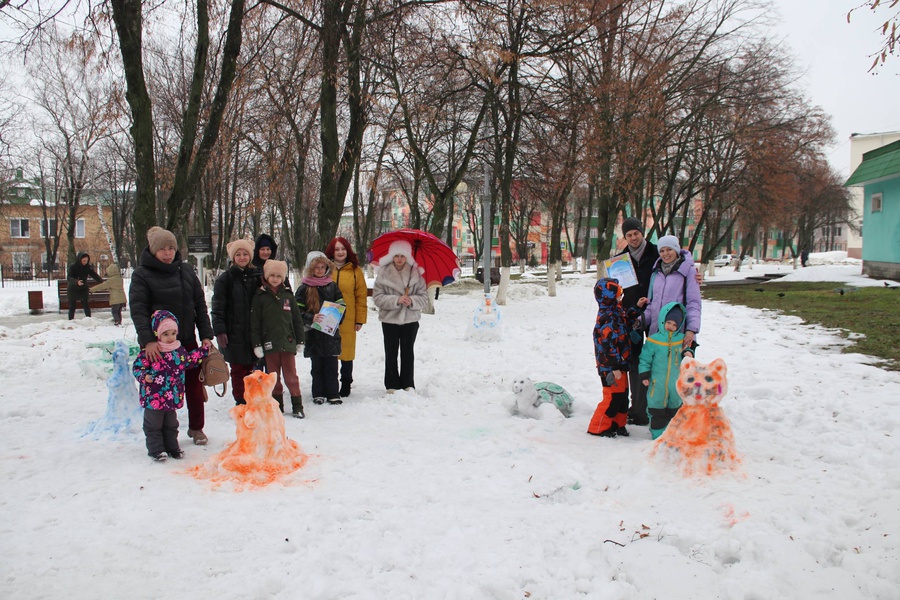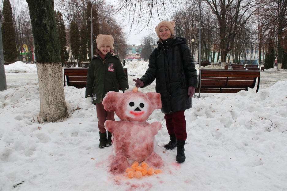 Пять команд с азартом ваяли снежные скульптуры и теперь сквер украшают яркие экспонаты: Чебурашка, Тигрокот, Снеговик на троне, Лисенок, Черепаха и даже Танк Ф-001!