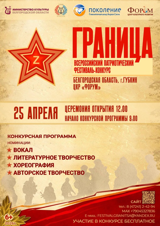 Проведение финального очного этапа фестиваля-конкурса – 25 апреля 2026 г. Место проведения – Белгородская область, город Губкин, ул. Мира,